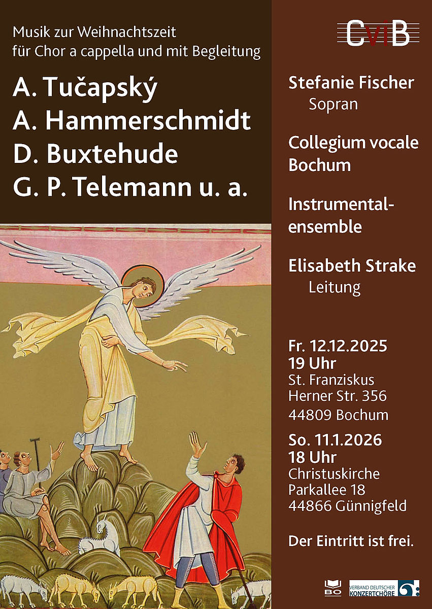 Das Collegium vocale Bochum und das Collegium instrumentale Bochum sind Kammermusikensembles mit Sitz in Bochum. Unter 'Ensembles' erfahren Sie mehr über uns. Wenn Sie sich beteiligen wollen - als Musiker/in oder als Förderer - dann wählen Sie einfach die Rubrik 'Mitwirken' bzw. die Rubrik 'Verein'.